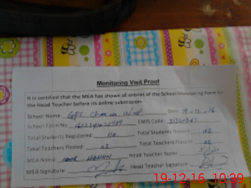 | Attendance Register | Head Teacher | MEA with School | Visit Proof |