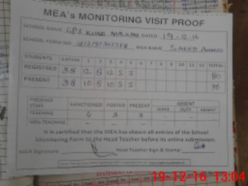 | Attendance Register | Head Teacher | MEA with School | Visit Proof |