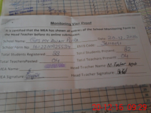 | Attendance Register | Head Teacher | MEA with School | Visit Proof |