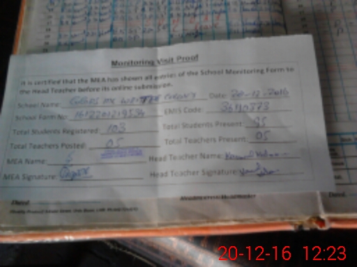 | Attendance Register | Head Teacher | MEA with School | Visit Proof |
