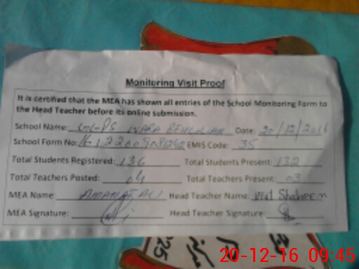 | Attendance Register | Head Teacher | MEA with School | Visit Proof |