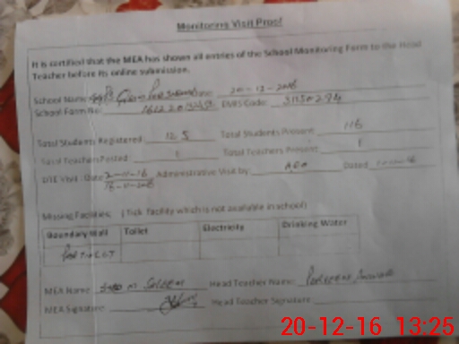 | Attendance Register | Head Teacher | MEA with School | Visit Proof |