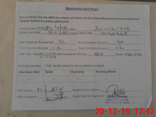 | Attendance Register | Head Teacher | MEA with School | Visit Proof |