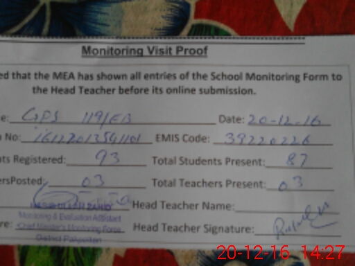 | Attendance Register | Head Teacher | MEA with School | Visit Proof |