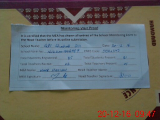 | Attendance Register | Head Teacher | MEA with School | Visit Proof |