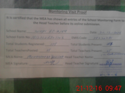 | Attendance Register | Head Teacher | MEA with School | Visit Proof |