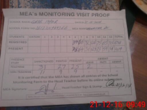 | Attendance Register | Head Teacher | MEA with School | Visit Proof |