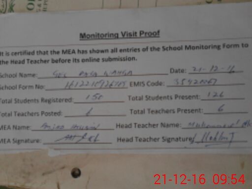 | Attendance Register | Head Teacher | MEA with School | Visit Proof |