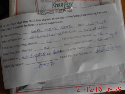 | Attendance Register | Head Teacher | MEA with School | Visit Proof |
