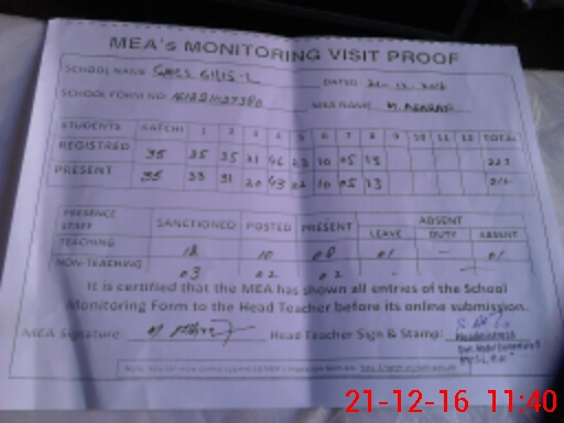 | Attendance Register | Head Teacher | MEA with School | Visit Proof |