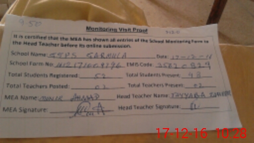 | Attendance Register | Head Teacher | MEA with School | Visit Proof |
