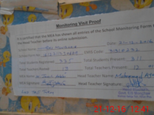 | Attendance Register | Head Teacher | MEA with School | Visit Proof |