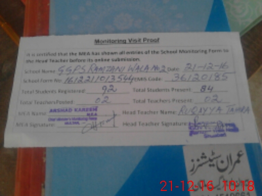 | EMIS Code: 36120185 | Name of School: GGPS RAMZANI WALA NO.2 | |||