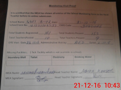 | Attendance Register | Head Teacher | MEA with School | Visit Proof |
