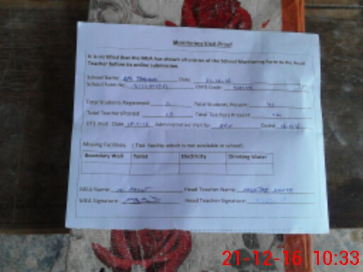 | Total no. of Classrooms: 2 No. of Classrooms Used for Teaching: 1 No. of Classrooms Storing Old Furniture, FTBs, etc: 1Comments if Any: ONE CLASSROOM DANGEROUS |