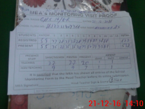 | Attendance Register | Head Teacher | MEA with School | Visit Proof |