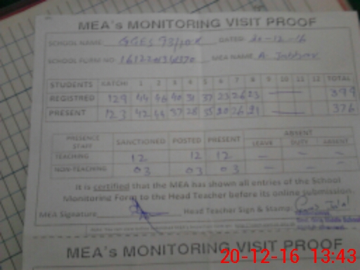 | Attendance Register | Head Teacher | MEA with School | Visit Proof |