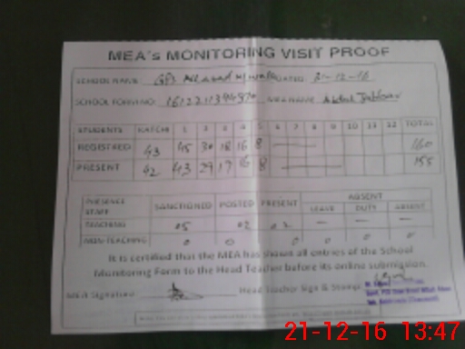 | Attendance Register | Head Teacher | MEA with School | Visit Proof |