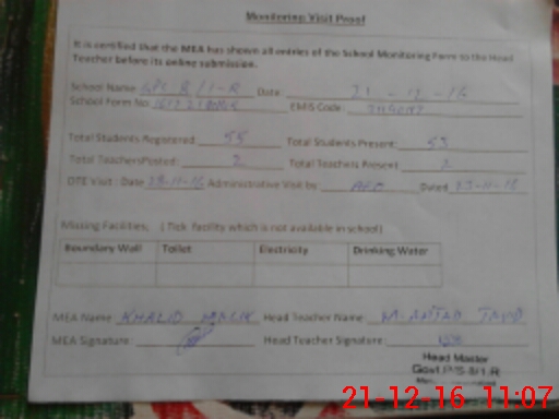 | EMIS Code: 31140117 | Name of School: GPS CHAK NO. 8/1-R | |||