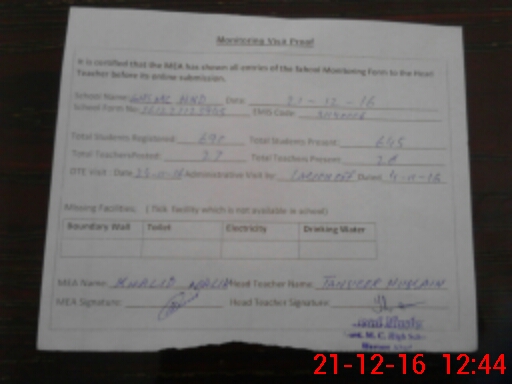 | Certified that this School was Inspected by the Undersigned MEA/DMO Today and the Information Stated Above is as Per Record. | |||||