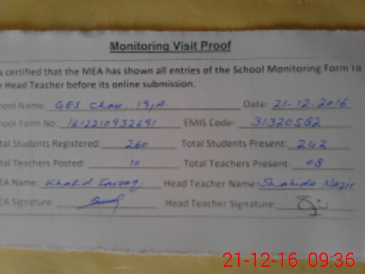 | EMIS Code: 31320582 | Name of School: GGES CHAK NO.19/A | |||