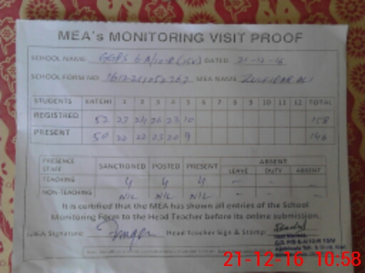 | Attendance Register | Head Teacher | MEA with School | Visit Proof |