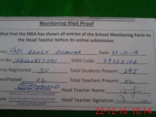 | EMIS Code: 39220126 | Name of School: GPS BEHLI DILAWAR | |||