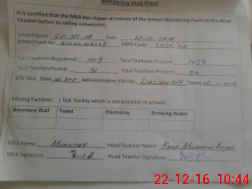 | Attendance Register | Head Teacher | MEA with School | Visit Proof |