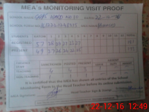 | Attendance Register | Head Teacher | MEA with School | Visit Proof |