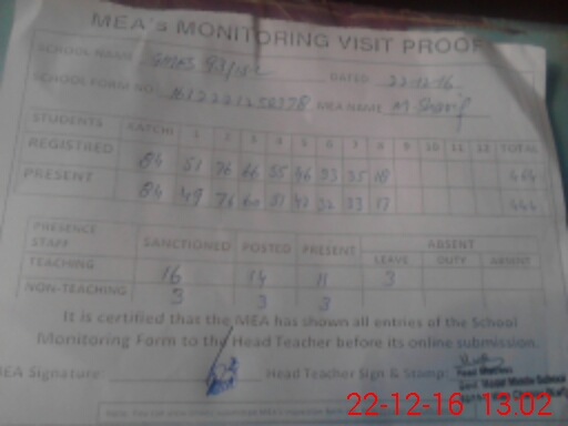 | Attendance Register | Head Teacher | MEA with School | Visit Proof |