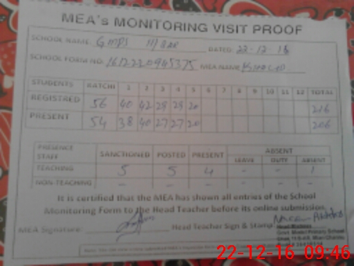 | Attendance Register | Head Teacher | MEA with School | Visit Proof |