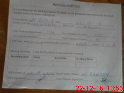 | Attendance Register | Head Teacher | MEA with School | Visit Proof |