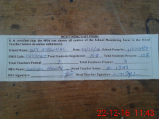 | Attendance Register | Head Teacher | MEA with School | Visit Proof |