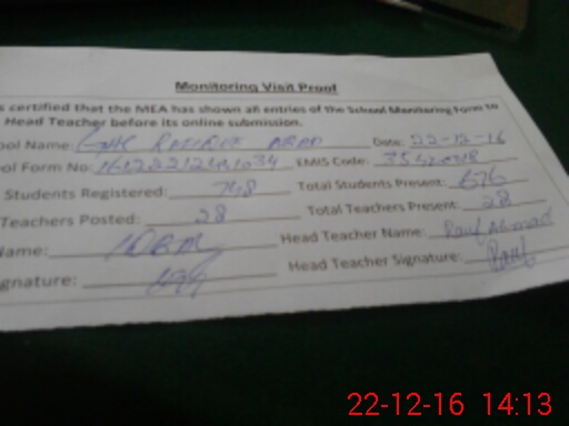 | Attendance Register | Head Teacher | MEA with School | Visit Proof |
