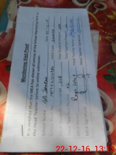 | Attendance Register | Head Teacher | MEA with School | Visit Proof |