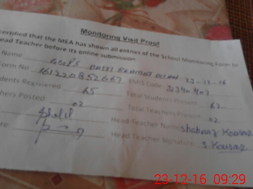 | Attendance Register | Head Teacher | MEA with School | Visit Proof |