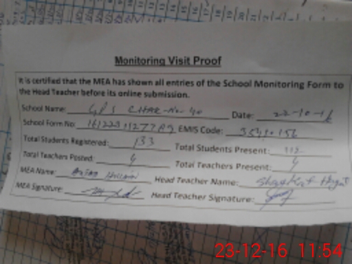 | Attendance Register | Head Teacher | MEA with School | Visit Proof |