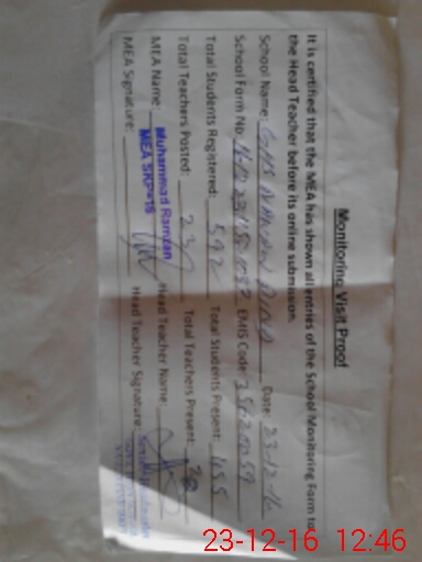 | Remarks (Use Separate Page if Required): 1 Teacher Muhammad Boota EST and Muhammad waseem J C Both are not present at school So as per sop marked absent 2 Due to end of Dec test students presence is low as 113 out of 592 3 Due to failure of software it is my 2nd attamp for filling up the school data | |||||