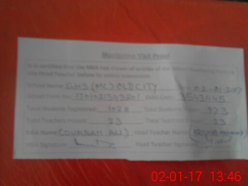 | Certified that this School was Inspected by the Undersigned MEA/DMO Today and the Information Stated Above is as Per Record. | |||||