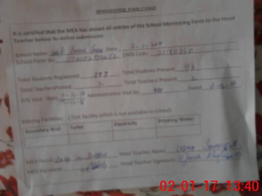 | School Visited by School Health & Nutrition Supervisor (No. of Visits) | Name1: | ZAMAN AFRIDI | Name2: | ||