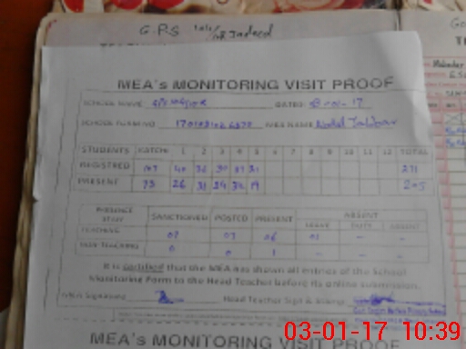 | Attendance Register | Head Teacher | MEA with School | Visit Proof |