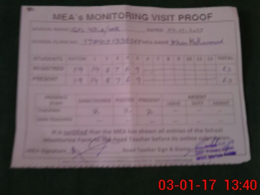 | Monitoring Date: 03-01-2017 | Start Time: 03-01-2017 01:17 PM | End Time: 03-01-2017 01:42 PM | Name of MEA: Kh**** Mu**** (S**** 05**** | |