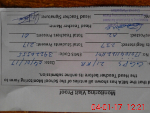 | Attendance Register | Head Teacher | MEA with School | Visit Proof |