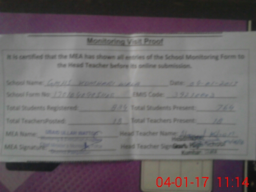 | Attendance Register | Head Teacher | MEA with School | Visit Proof |