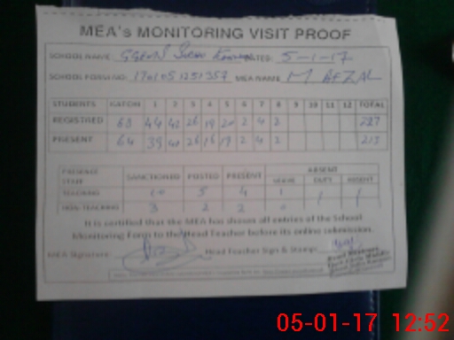| Attendance Register | Head Teacher | MEA with School | Visit Proof |