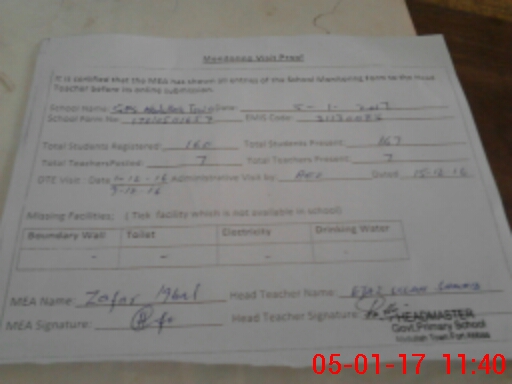 | Attendance Register | Head Teacher | MEA with School | Visit Proof |