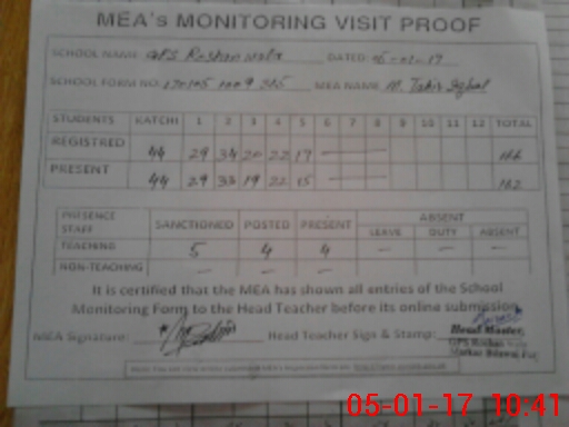 | Attendance Register | Head Teacher | MEA with School | Visit Proof |