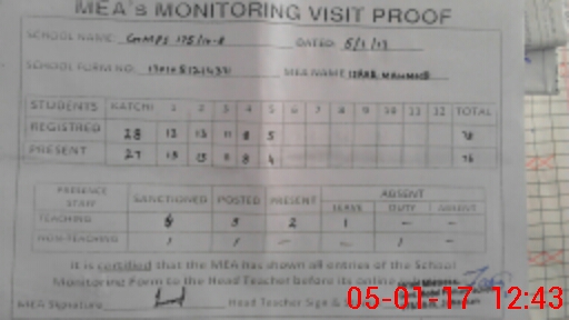 | Attendance Register | Head Teacher | MEA with School | Visit Proof |