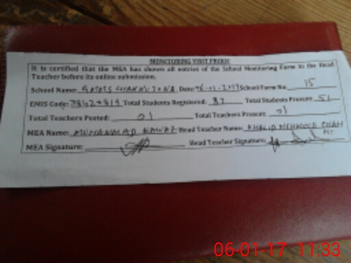 | Attendance Register | Head Teacher | MEA with School | Visit Proof |