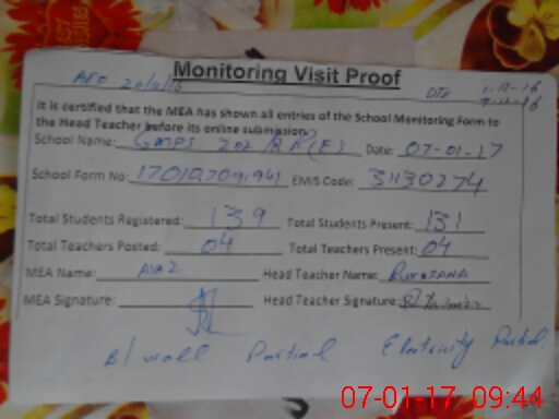 | Attendance Register | Head Teacher | MEA with School | Visit Proof |